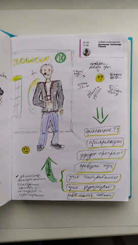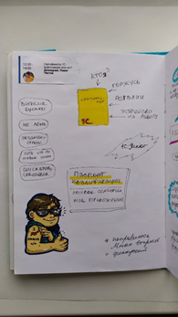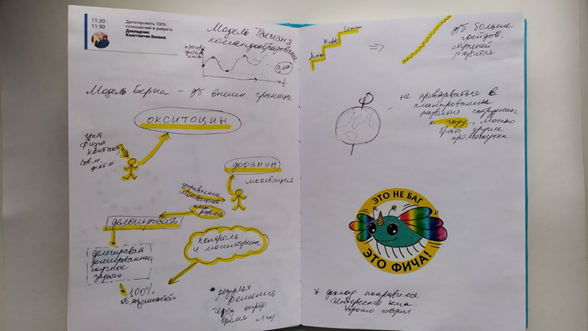 — Я конспектировала доклады прямо во время выступлений спикеров, но не полностью писала содержание - для этого можно скачать презентацию. Я отмечала только те моменты, что мне больше всего понравились, заинтересовали, как-то зацепили. И делала это не сплошным текстом, а схемами, картинками, тезисами - такие визуальные заметки. Так как я делала это именно там, то кроме смысла я смогу вспомнить и свои ощущения и эмоции от доклада.