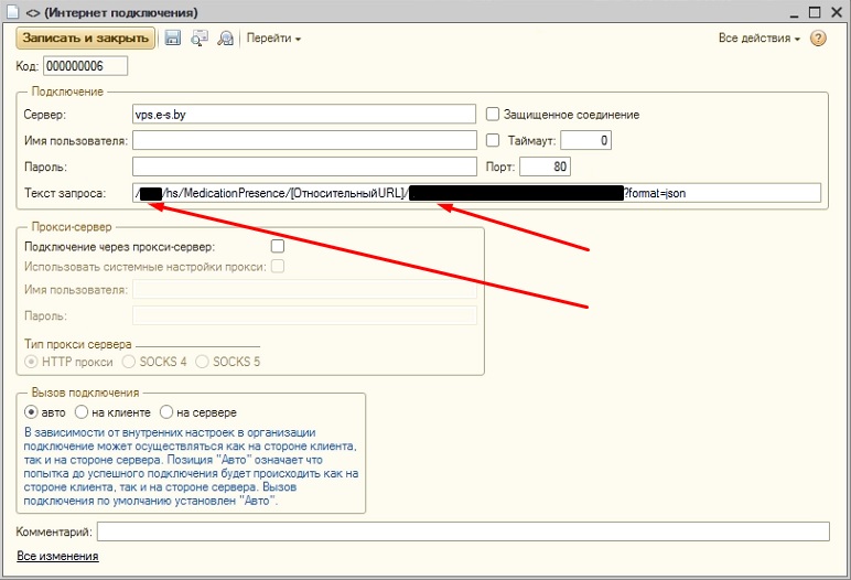1. Создание нового элемента в справочнике «Интернет подключения». Обязательные для заполнения поля настройки подключения: сервер, порт, текст запроса. Текст запроса должен иметь вид: /[ИмяСервера]/hs/MedicationPresence/[ОтносительныйURL]/[Organization_id]?format=json, где вместо [ИмяСервера] и [Organization_id] необходимо указать полученные для подключения данные.