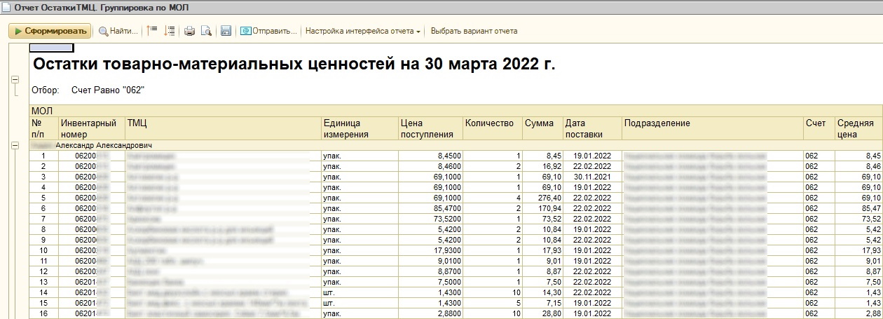 5. Формирование отчета «Остатки ТМЦ». Для проверки остатков товарно-материальных ценностей и формирования печатной формы можно воспользоваться отчетом «Остатки ТМЦ».