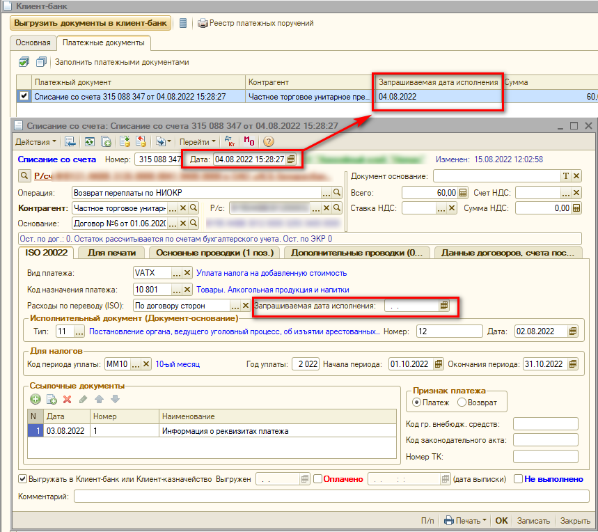 В документах «Платежное требование», «Списание со счета», «Списание со счета (валюта)» отменено обязательное заполнение реквизита «Запрашиваемая дата исполнения» на вкладке «ISO 20022». Если дата не заполнена, то вместо неё в файле выгрузки автоматически подставится дата документа.