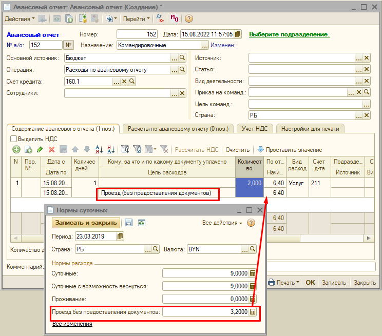В документе теперь можно рассчитывать размер возмещения за проезд в случае, если не предоставлены проездные документы. В поле «Цель расходов командировки» добавлено новое значение «Проезд (без предоставления документов)». Для авансового отчёта в валюте важно подобрать страну и валюту.