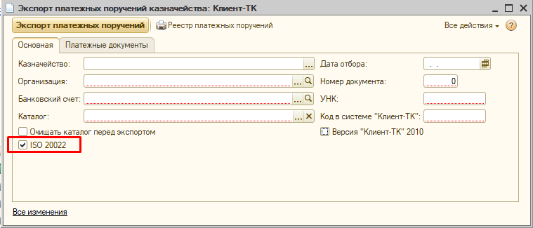 Если в учётной политике установлена настройка «Работа платежных документов в соответствии с требованиями ISO 20022», то при открытии формы обработки автоматически будет проставлен флажок «ISO 20022».