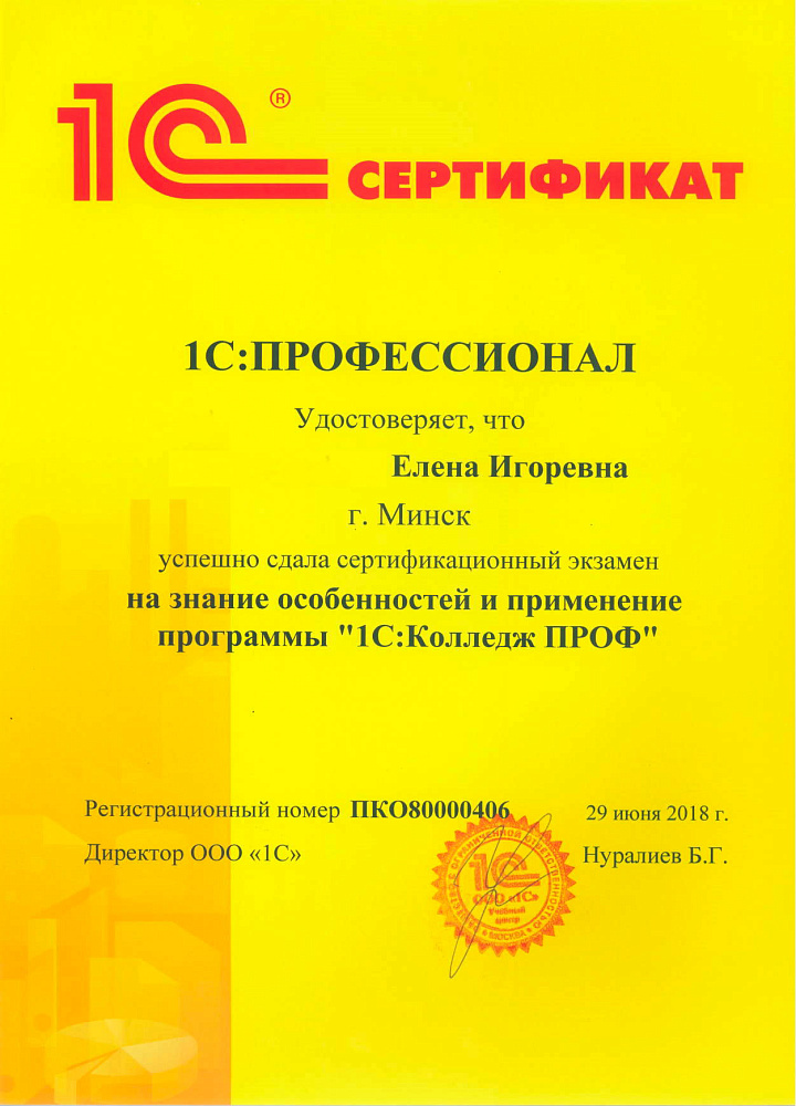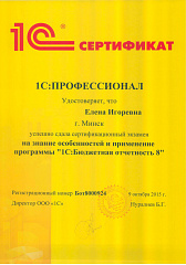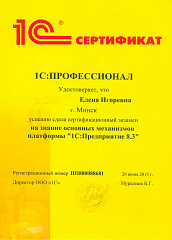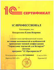 Выражаем огромную благодарность Елене Игоревне за помощь в работе с программным продуктом 1С-Бухгалтерия, за добросовестное отношение к своим задачам и высокий профессионализм.