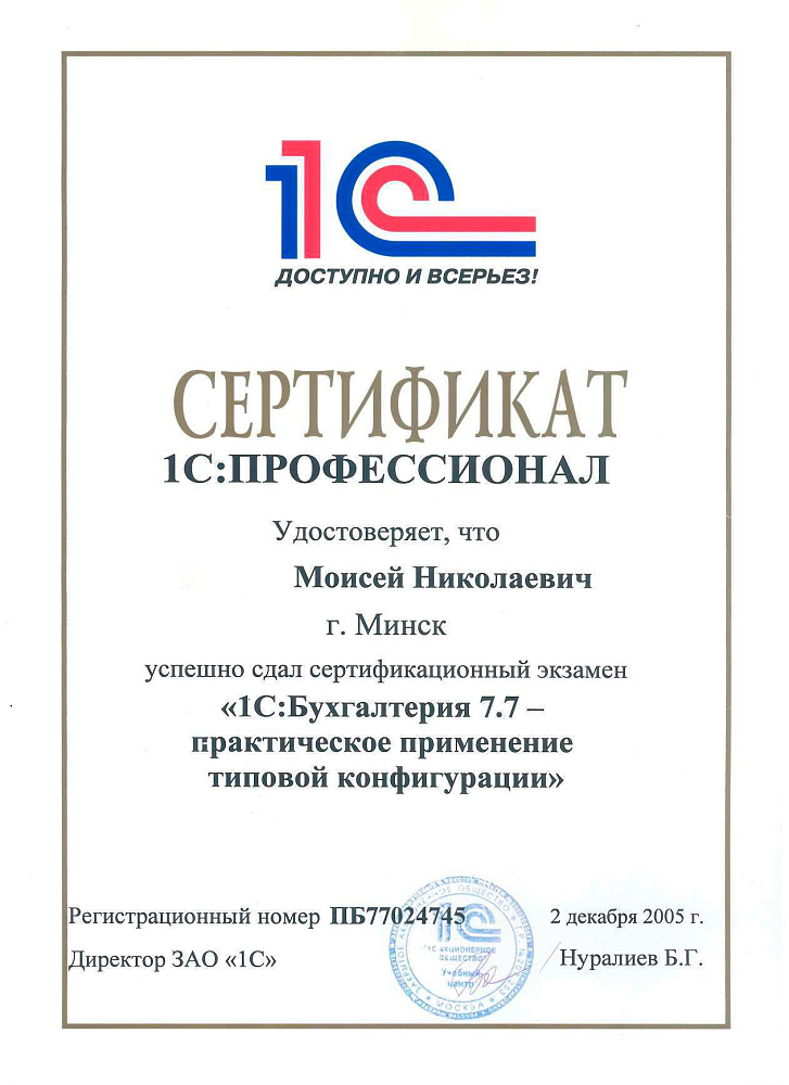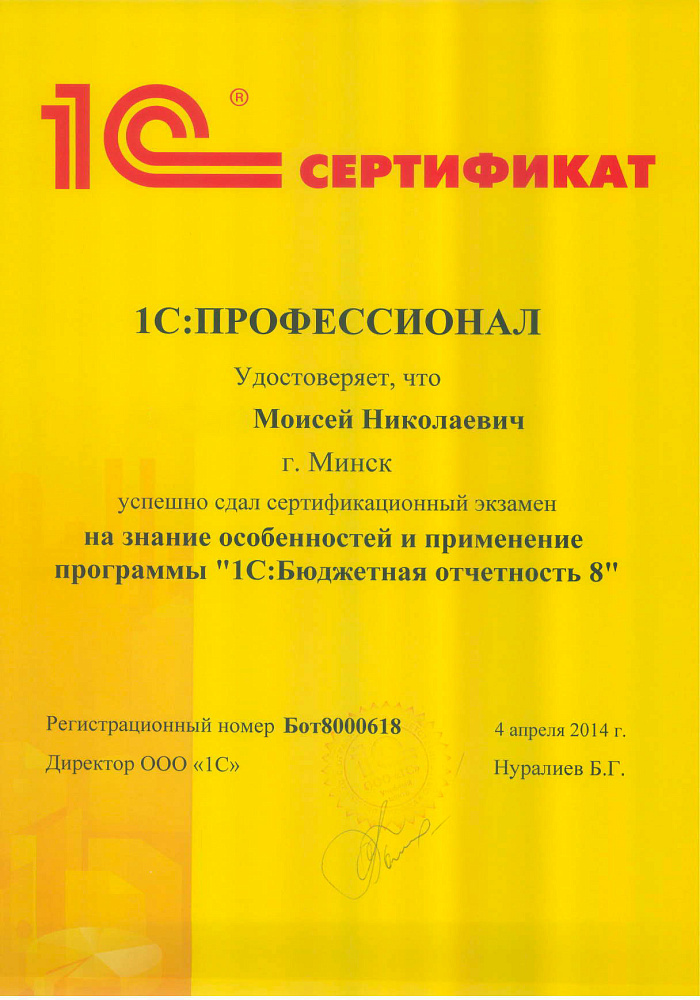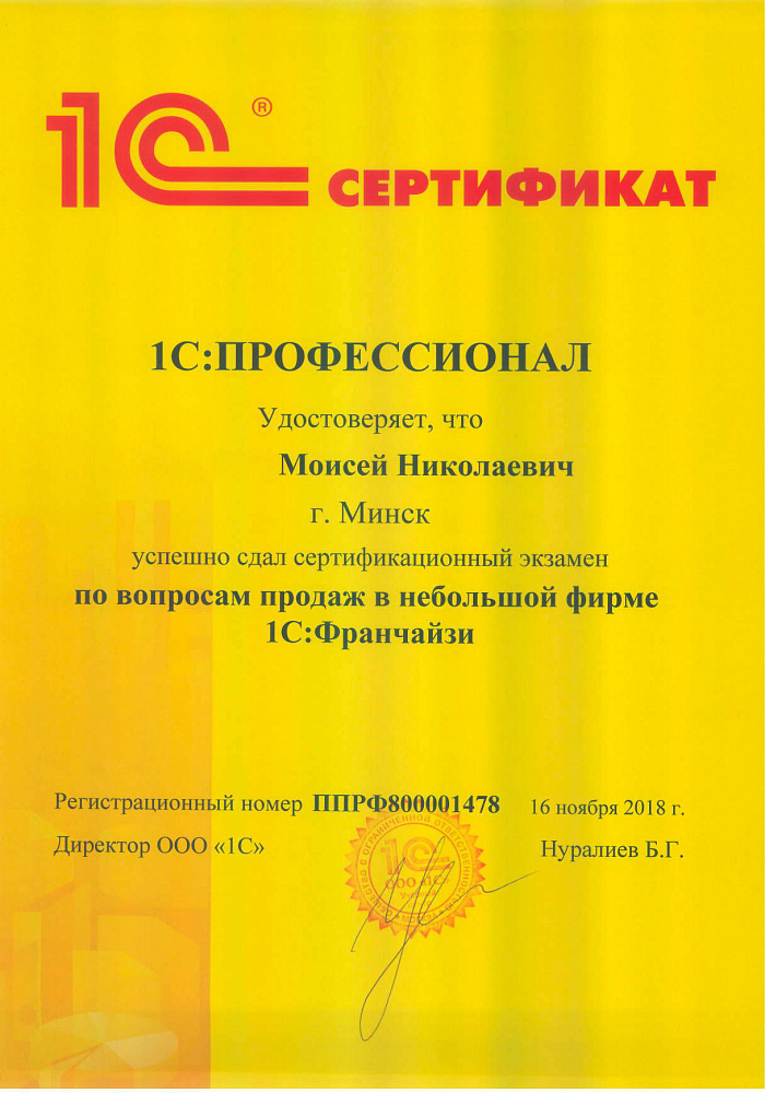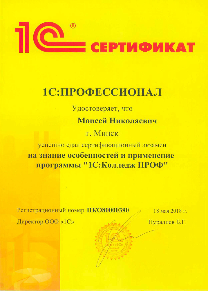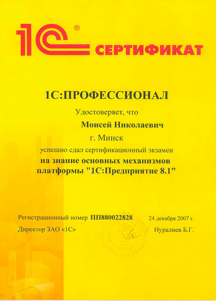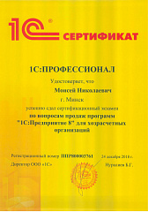 Работа с программным комплексом 1С и специалистом Моисеем Николаевичем устраивает, претензий нет.