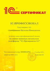 Хочу поблагодарить Наталью за проделанную работу по внедрению 1С. Наталья очень вежлива и компетентна. Информацию дает доступно и поэтапно. Настроила приказы по отпускам, контракты, напоминания, отчеты, курсы повышения квалификации, прием по СУНам. Рекомендую Наталью сотрудникам для обучения в программе 1С.
