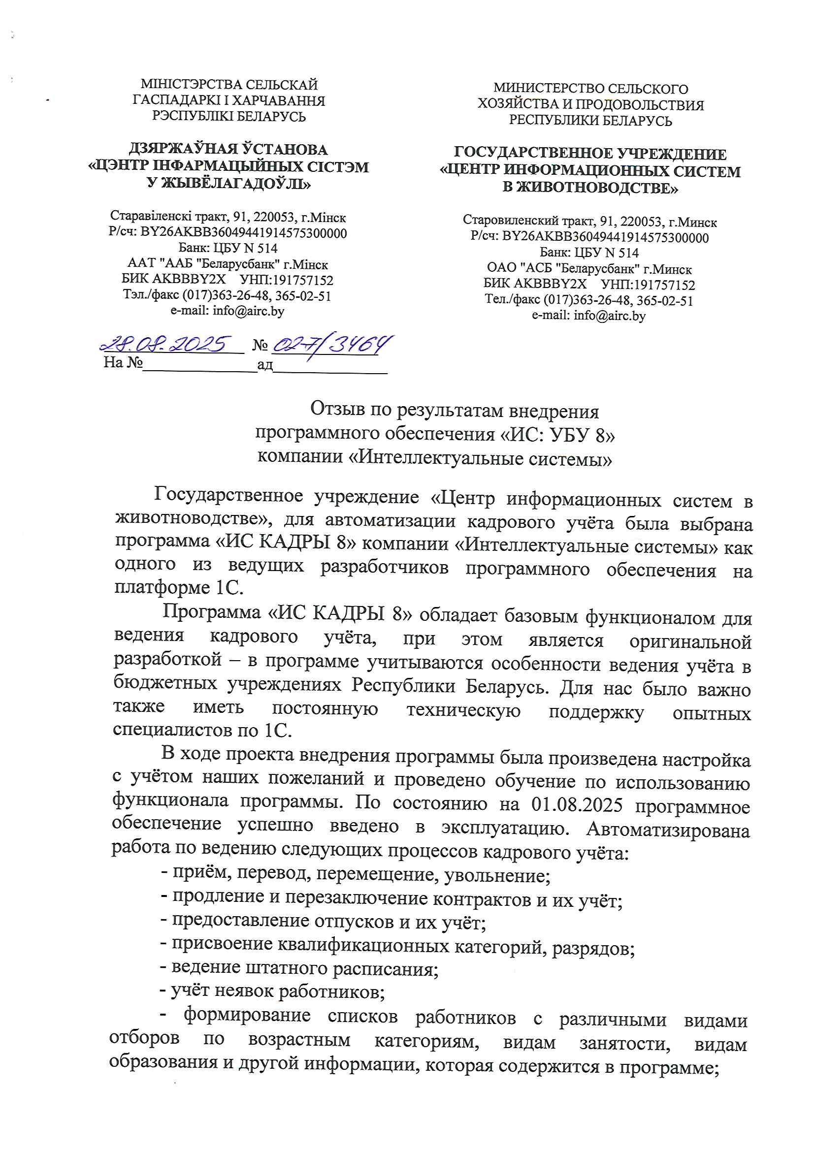 Государственное учреждение «Центр информационных систем в животноводстве», для автоматизации кадрового учёта была выбрана программа «ИС КАДРЫ 8» компании «Интеллектуальные системы» как одного из ведущих разработчиков программного обеспечения на платформе 1С.