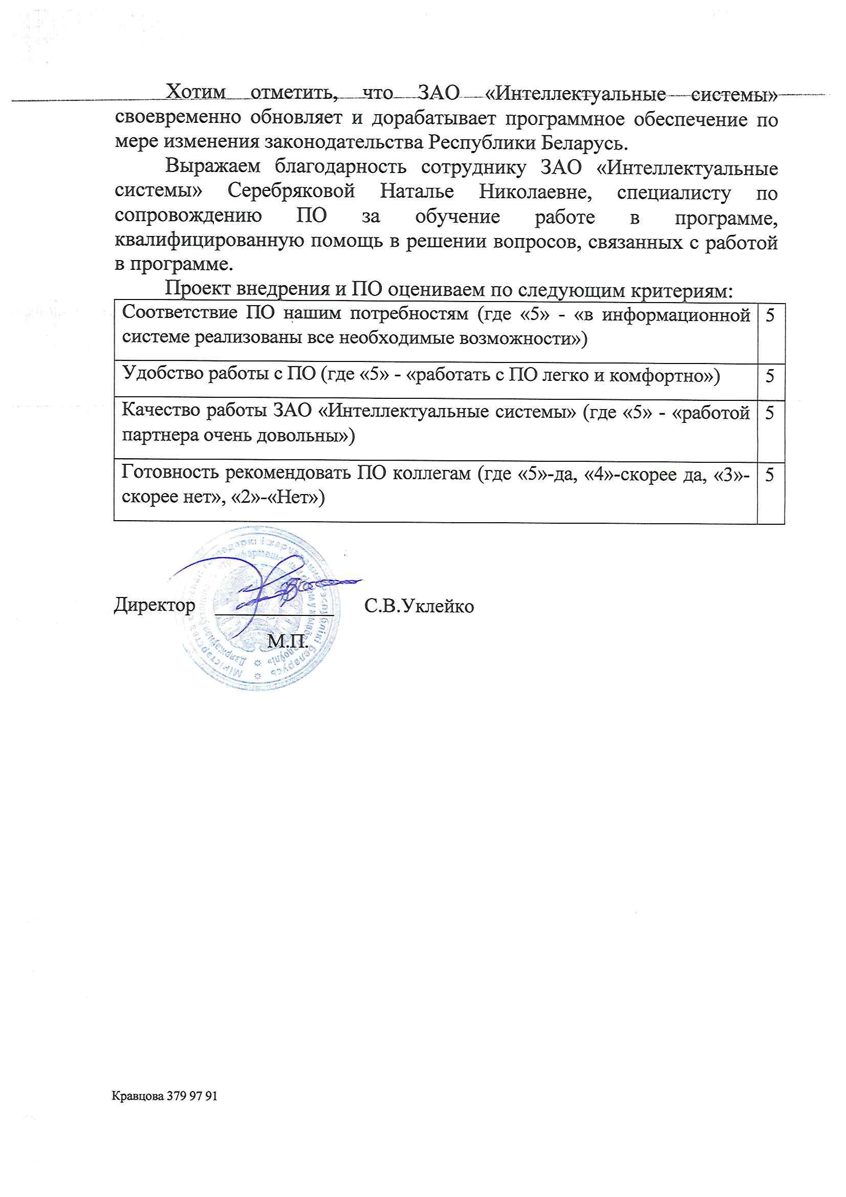 Выражаем благодарность сотруднику ЗАО «Интеллектуальные системы» Серебряковой Наталье Николаевне, специалисту по сопровождению ПО за обучение работе в программе, квалифицированную помощь в решении вопросов, связанных с работой в программе.