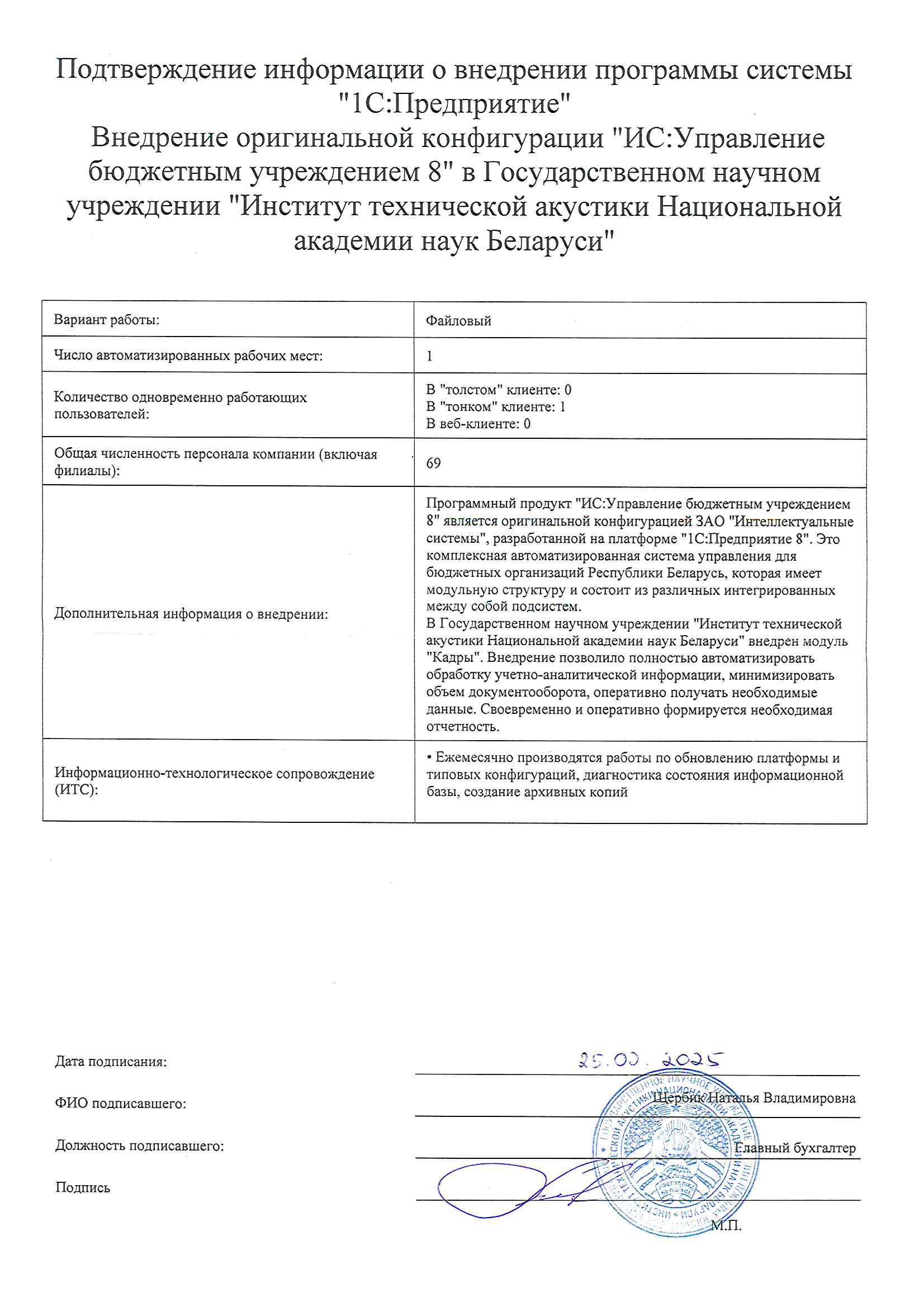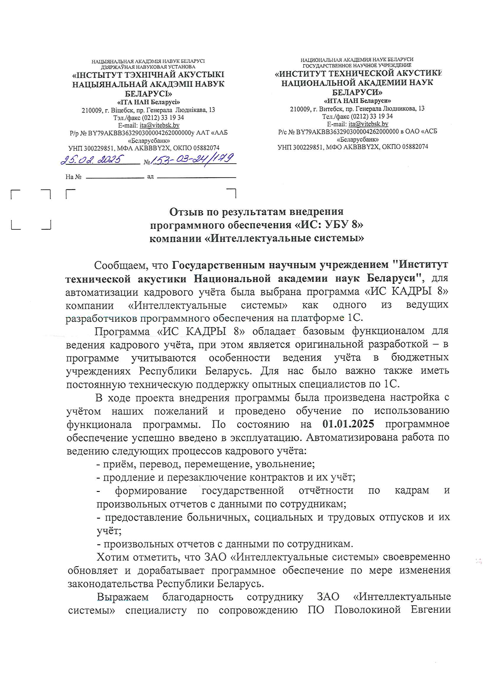 Сообщаем, что Государственным научным учреждением "Институт технической акустики Национальной академии наук Беларуси", для автоматизации кадрового учёта была выбрана программа «ИС КАДРЫ 8» компании «Интеллектуальные системы» как одного из ведущих разработчиков программного обеспечения на платформе 1С.