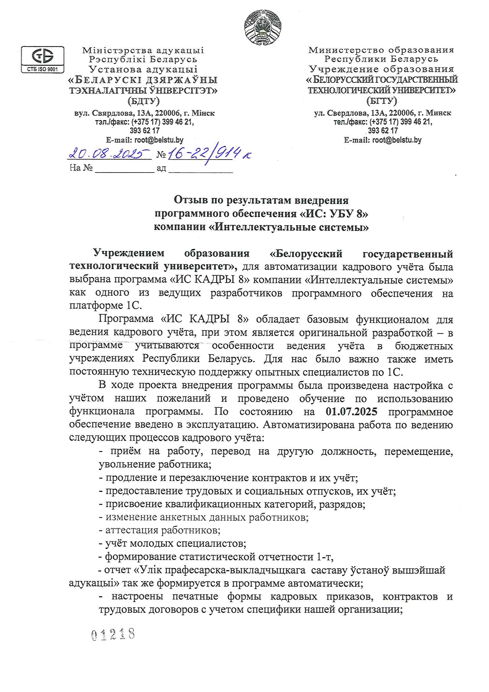 Учреждением образования «Белорусский государственный технологический университет», для автоматизации кадрового учёта была выбрана программа «ИС КАДРЫ 8» компании «Интеллектуальные системы» как одного из ведущих разработчиков программного обеспечения на платформе 1С.