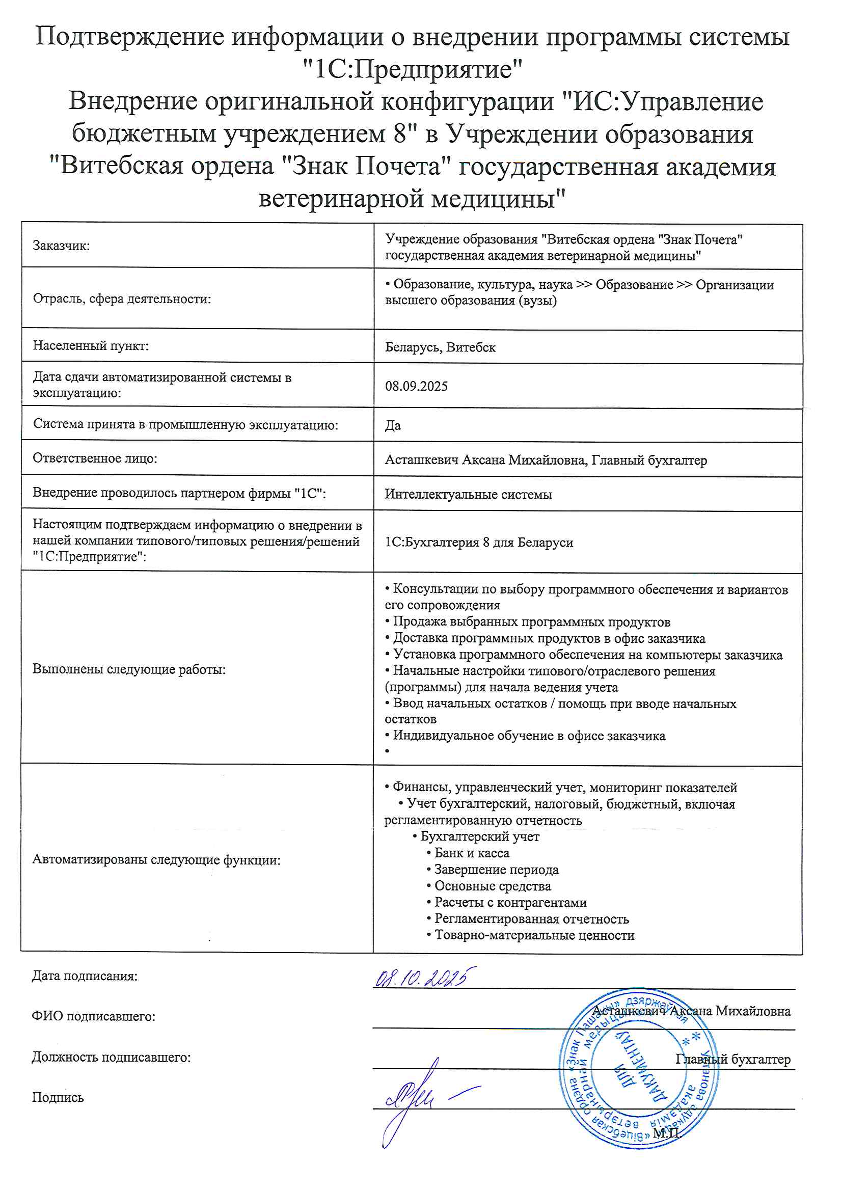 С 8 сентября 2025 г ПО введено в эксплуатацию в полном объеме.
