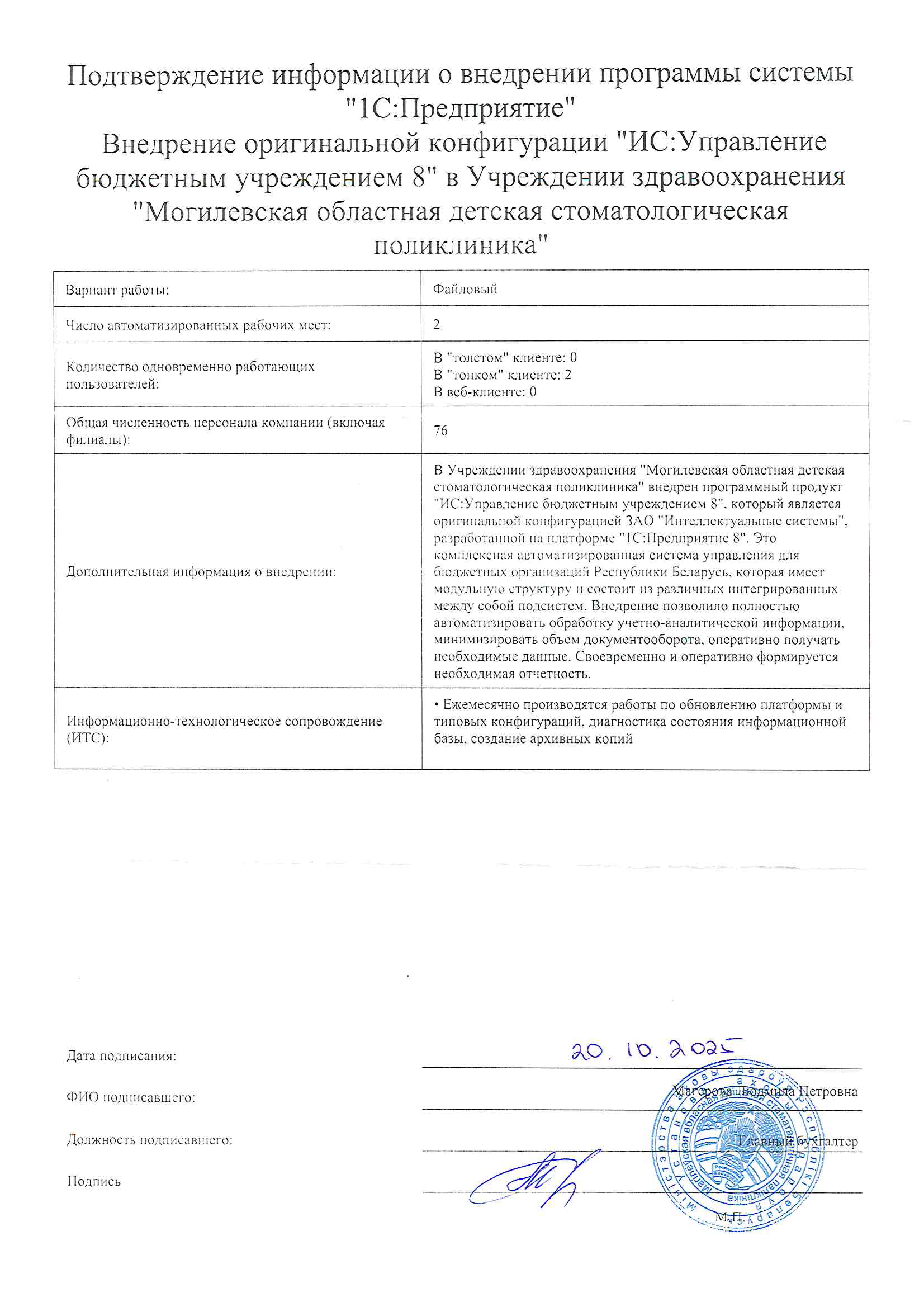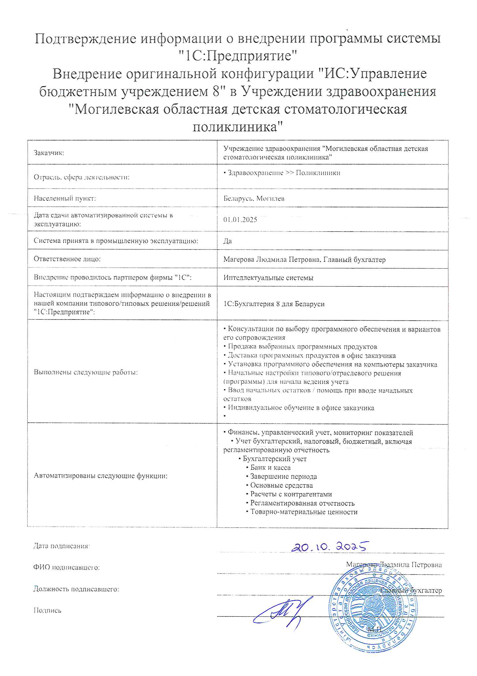 По состоянию на 01.01.2025 года ПО полностью введено в эксплуатацию. В рамках договора на абонентское обслуживание мы регулярно получаем обновления конфигурации и необходимые консультации.