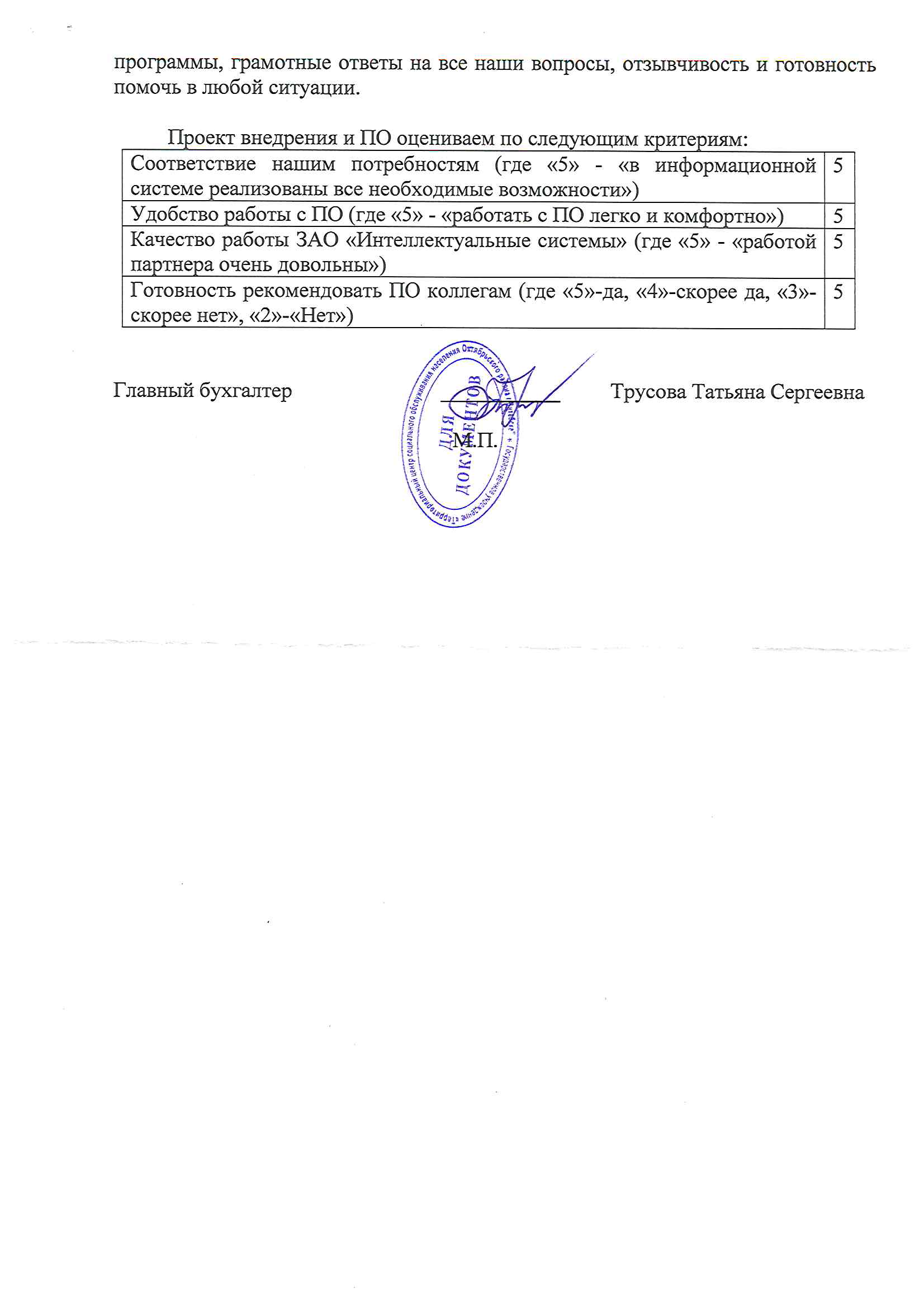 Выражаем благодарность коллективу ЗАО «Интеллектуальные системы» в особенности – Водяниковой Вере Владимировне за помощь в освоении программы, грамотные ответы на все наши вопросы, отзывчивость и готовность помочь в любой ситуации.