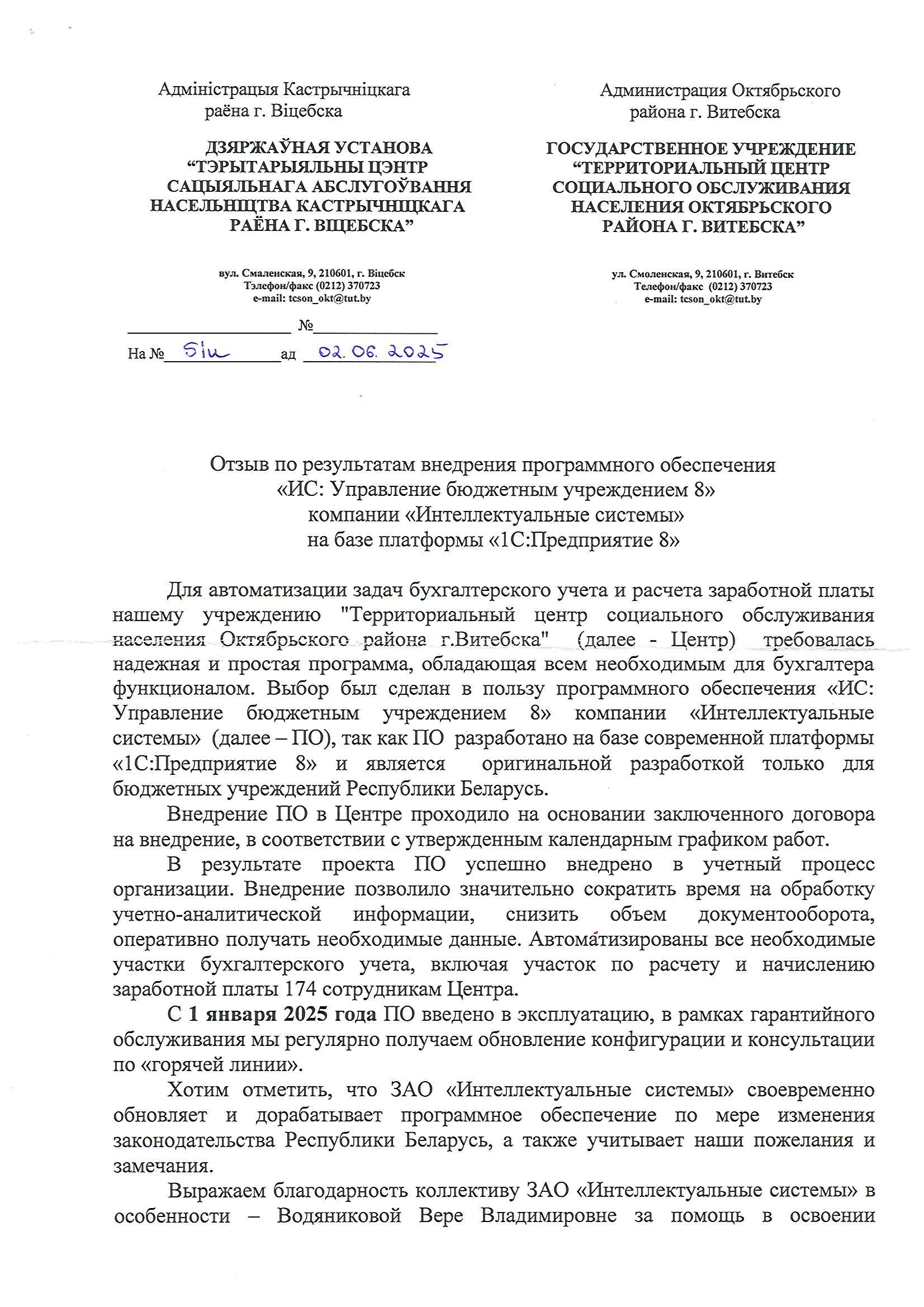 Для автоматизации задач бухгалтерского учета и расчета заработной платы нашему учреждению "Территориальный центр социального обслуживания населения Октябрьского района г.Витебска" (далее - Центр) требовалась надежная и простая программа, обладающая всем необходимым для бухгалтера функционалом. Выбор был сделан в пользу программного обеспечения «ИС: Управление бюджетным учреждением 8» компании «Интеллектуальные системы» (далее – ПО), так как ПО разработано на базе современной платформы «1С:Предприятие 8» и является оригинальной разработкой только для бюджетных учреждений Республики Беларусь.