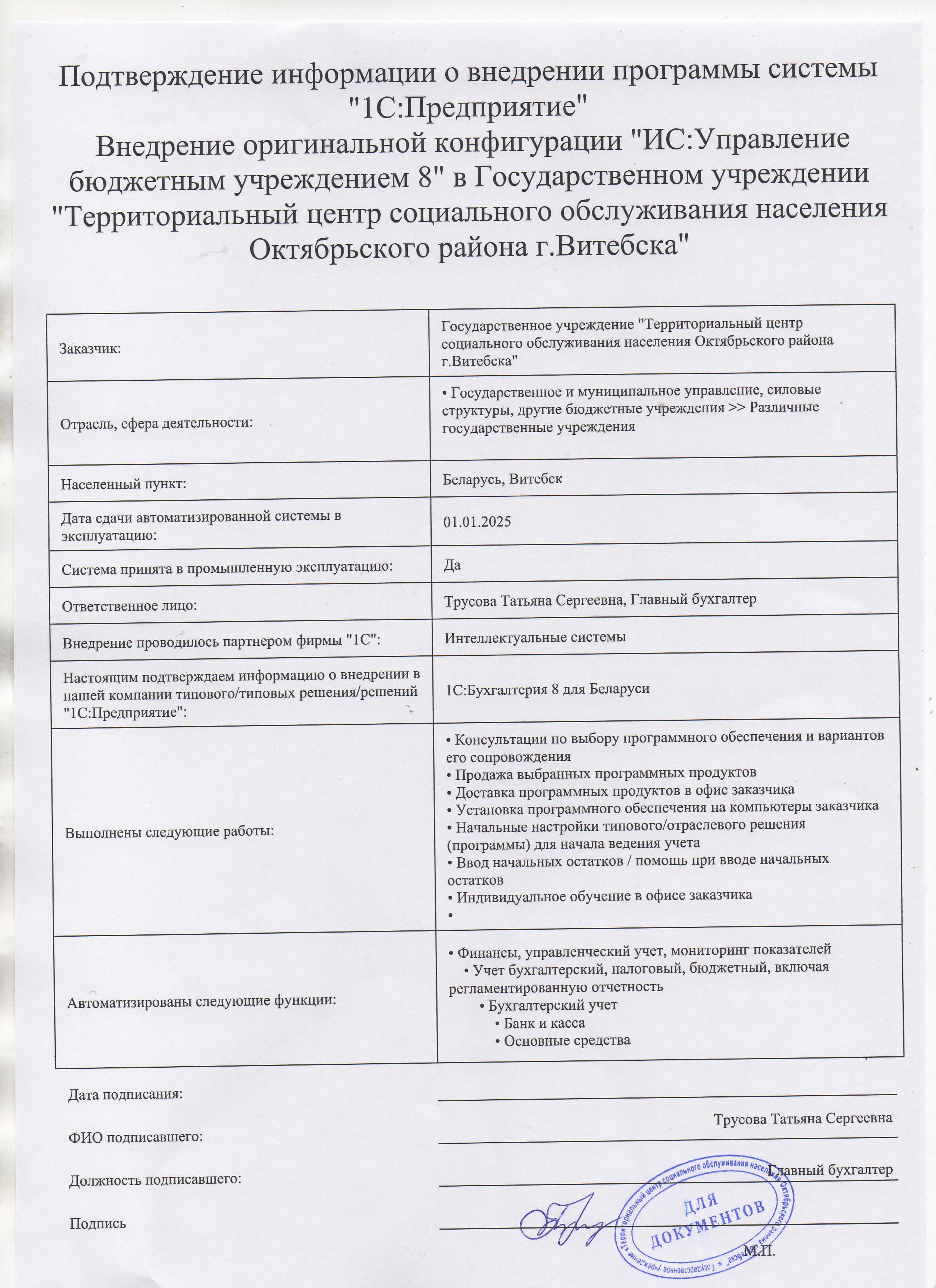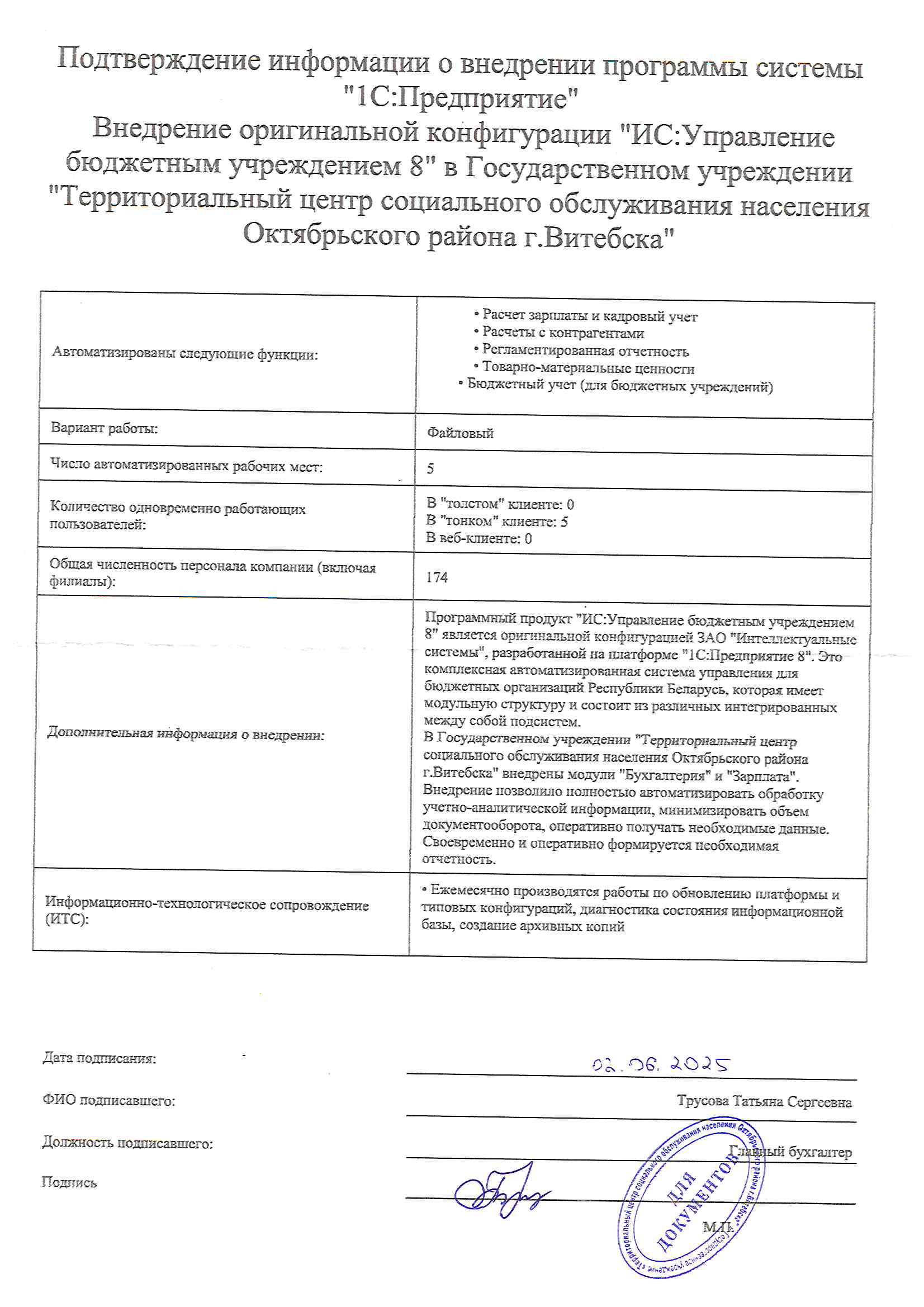 Внедрение 1 С в Государственном учреждении "Территориальный центр социального обслуживания населения Октябрьского района г.Витебска"