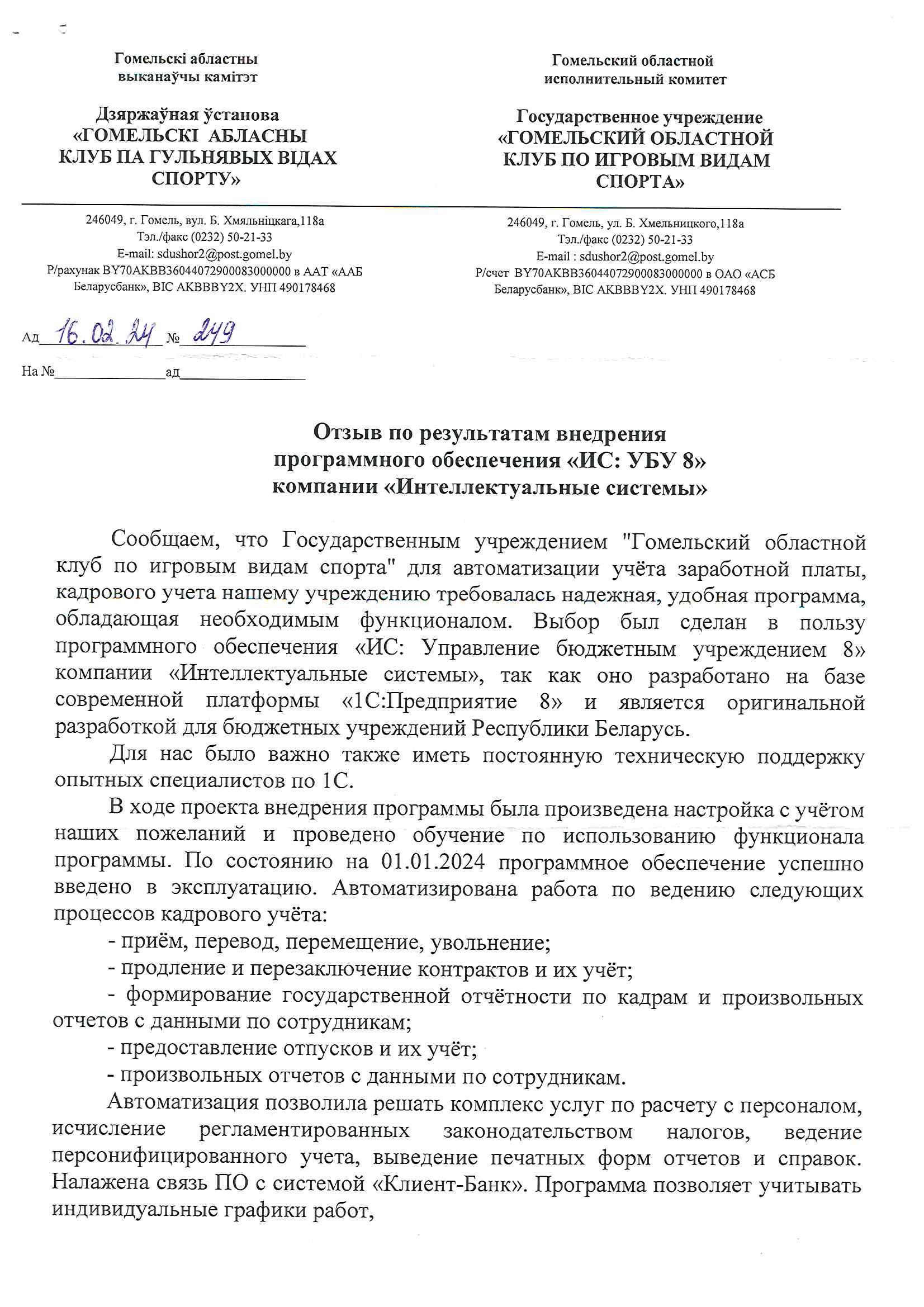 Сообщаем, что Государственным учреждением "Гомельский областной клуб по игровым видам спорта" для автоматизации учёта заработной платы, кадрового учета нашему учреждению требовалась надежная, удобная программа, обладающая необходимым функционалом. Выбор был сделан в пользу программного обеспечения «ИС: Управление бюджетным учреждением 8» компании «Интеллектуальные системы», так как оно разработано на базе современной платформы «1С:Предприятие 8» и является оригинальной разработкой для бюджетных учреждений Республики Беларусь.