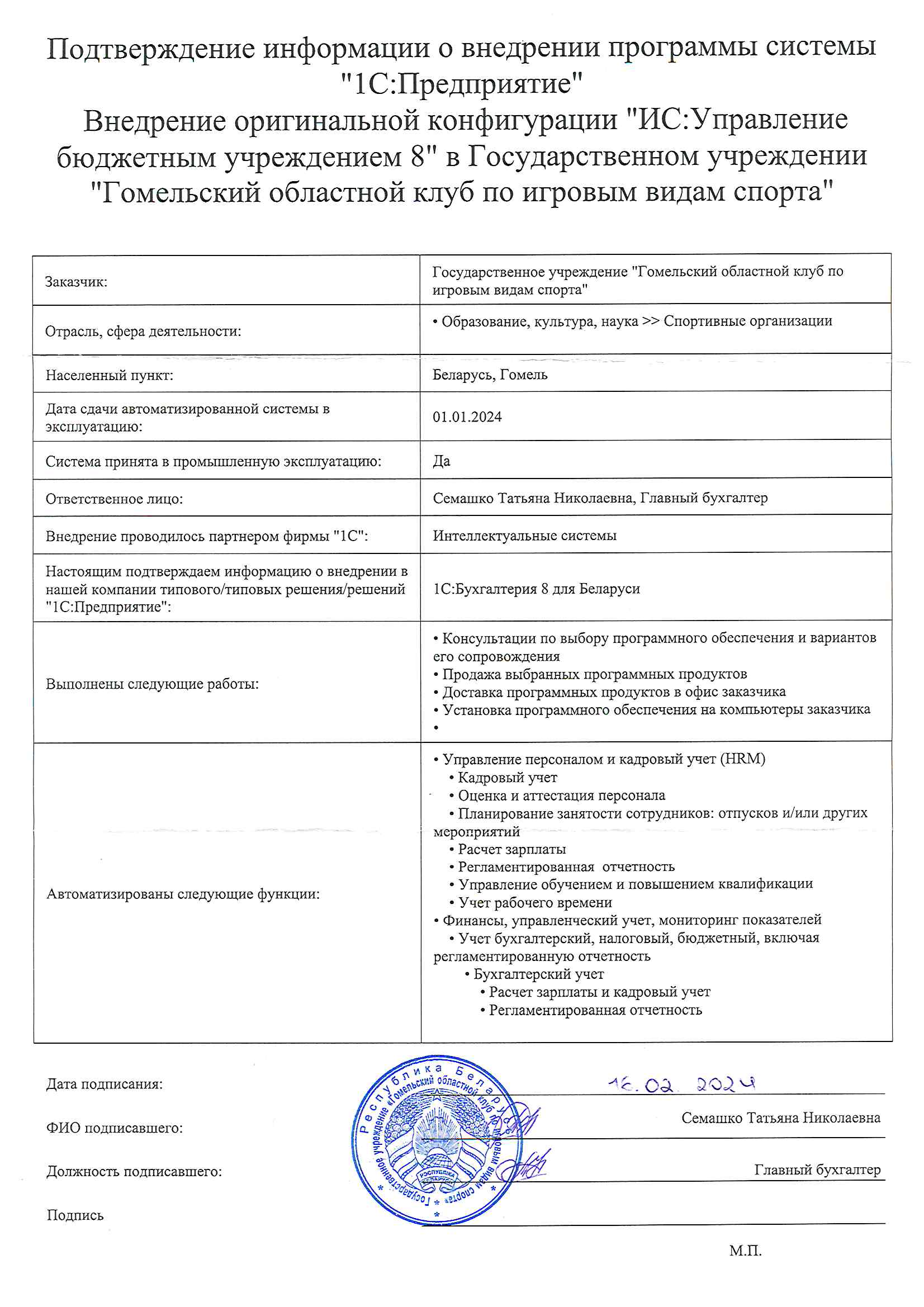 Внедрение 1С в государственном учреждении "Гомельский областной клуб по игровым видам спорта"